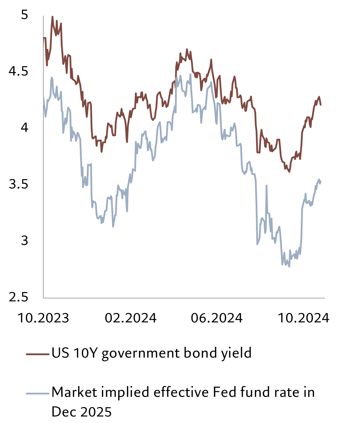 In sovereign debt, we remain neutral most developed government bonds. The picture is slightly muddled for US Treasury bonds: solid growth and the rising probability of a Trump sweep are clear negatives, but the recent rise in term premia – the risk component of bond returns – and the significant reduction in implied Fed rate cuts till end of 2025 are important offests. Net-net that doesn’t give a strong signal in either direction, while valuation suggests the bonds are broadly fair value after yields moved sharply higher over recent weeks reflecting the strength of the economy and Trump’s strength in the polls (see Fig. 4).